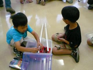 〈ころりん〉とピコピコカプセルづくりをやりました。 時間は〈ころりん〉40分,ガリレオさんの紙芝居を10分, 休憩を15分,その後55分はピコピコカプセルづくりです。 今回,阿久津さんのやったピコピコカプセルの遊び方はこちら。 こんな遊び方もあるんですねぇ~。 ご参考にされてはいかがでしょう? ・1mのモール(壁に電線を固定するためもので「コ」形状を しているものが組み合わさっているもの)を配り, それを使って転がしてもらう。 ・「ピコピコカプセルそうめん流し」(『たのしい授業』に載っていたそうです) 「ピコピコカプセルそうめん流し」ってなんか面白そうな名前ですね~。 2mの雨どいを傾斜させ,50個くらいのピコピコカプセルを転がし それをお箸をでつかみとってもらう…というものらしいです。 お箸とコップをもって,雨どいの周りに4人ほど来てもらい, いくつつかみ取れるか競争してもらうのだとか。 (……これは楽しそうだ) とっても盛り上がったそうです(^^) 講師の阿久津さんもお客さんの笑顔に満足なご様子でした~。