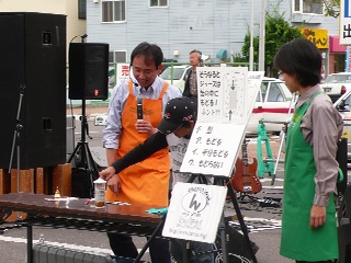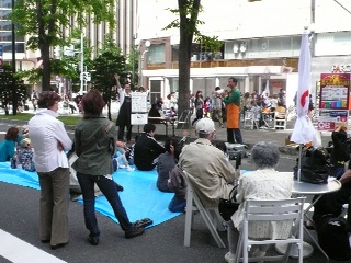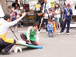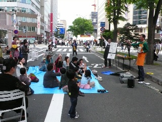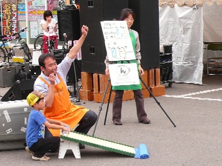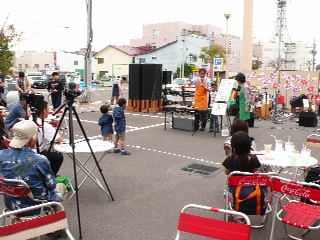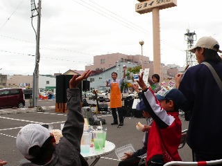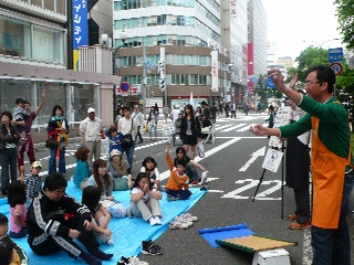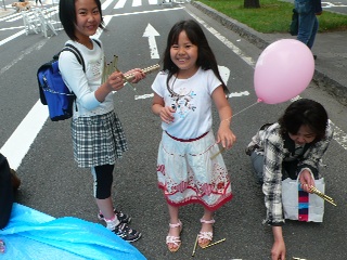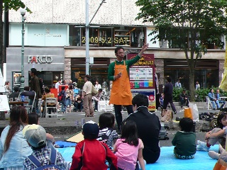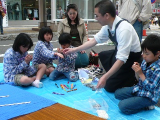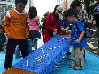 「大通街なか劇場」というイベントで大道仮説実験を行ないました。 1時半から4時まで,大道仮説実験〈ころりん〉とピコピコカプセルづくり 「バンジーチャイム演奏会」を行ないました。 イベントに来られた方を呼び止めながらの,まさにストリートライブ状態です。 講師は小出さん,樋栄さん,そしてワタクシ祖父江です。 【写真提供:祖父江】 今回,ひさびさに自分も講師をしました。やっぱりお客様の笑顔は嬉しいですね! ほとんどのお客様が最後まで見て下さっていました(^^) ストリートライブ形式でもピコピコカプセルづくりが大人気だったのは驚きでした。 お母さんが感動して人を集めてくれたりスゴかったです!