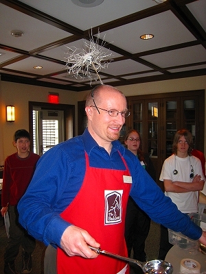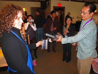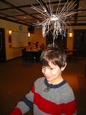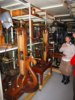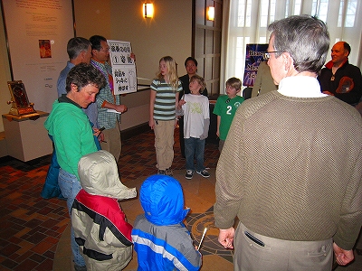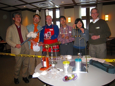 バッケン博物館に見学に行きました。 この博物館は、アール・バッケン(Earl Bakken)さんという 心臓のペースメーカの改良・販売で財を成した方が収集していた 資料や文献、実験器具類などを元に設立した民間の博物館です。 最近には児童向けの教育プログラムに重点を置いての活動しているそうです。 展示するだけでなく,研究所も兼ねているところがユニークで魅力的です。 今回遠いアメリカのバッケン博物館にまで見学に行ったのは 「たのしい科学の伝統や科学教育に立ち返るために 素敵なお金の使い方をしているモデルを見たい! それは今後の楽知ん研究所の活動にも関わってくるかもしれない」 と考えたからです。 それでは,仲間の報告を元に,この見学の様子を紹介していきたいと思います。 品のいい素敵な建物ですね~。これがバッケン博物館です。 やっぱり日本の科学館とか博物館のイメージとは違います。 個人の邸宅を博物館にしたもので,すぐ隣は湖なんだそうです。 ここにある図書館にはフランクリンの原著もあります。 写真はノレという人の本ですが,見る限り手のひらサイズ!ですね。 貴重な本なので,〈本を置く専用の布団?〉と〈本を開きすぎないための枕〉 の上で,〈蛇のヌイグルミ〉のしおりを使って読むんだそうです。 司書の方がとても優秀な方で蔵書の内容をほとんど把握されているとか, スゴイ!蔵書を生きた研究資料にするにはこういう人材が必要なんでしょうね。 この起電機の大きさといったら! 残念ながら触ることができなかったそうなんですが,たくさんの 起電機や実験器具があったそうです。 フランクリンの発明した楽器アーモニカもあったのだとか! なんとバッケン博物館で〈びりりん〉(全部ではない)と バンジーチャイム演奏会をやってしまったそうです。 アメリカの人が「ひらひら君」をつけているのは新鮮な感じです(^^; そして,館長さんともお話しすることができたそうです。 時間が短かったことや,通訳を介さないと会話できないことで 色々と難しかったようですが,それでも報告を聞く限り 収穫は多かったと思います。 その後,昨年のフランクリン研究会でも活躍した吉川さんの 静電気実験の実験器具を紹介して,実際にお客さんにも参加してもらい 実験を見てもらうことができたそうです。 これにはスタッフの方も驚いていたそうです。 言葉が通じないため,ちゃんと通じ合えているか不安だったみたいですが, スタッフの方も関係する実験器具を紹介してくれて,閉館間際になって 通じ合えたことが分かったそうです。 私はこの見学には参加しなかったのですが,それでも報告を聞いて かなりワクワクすることができました。今回色々と世話をして頂いた 現地の伊東さんとジムさんには本当に感謝申し上げます。