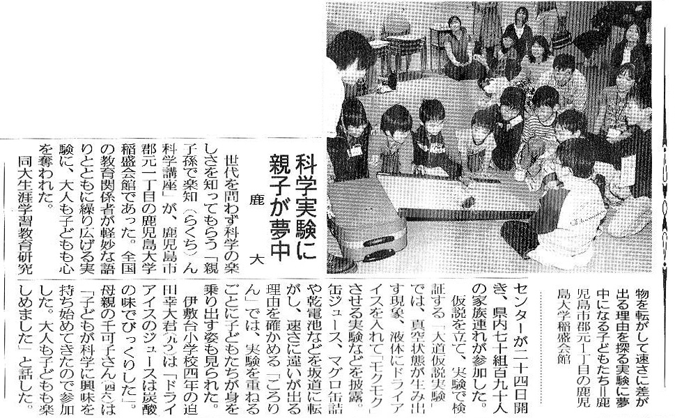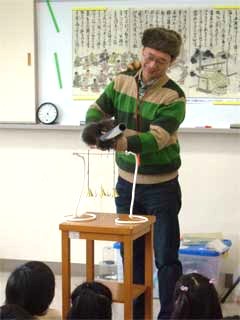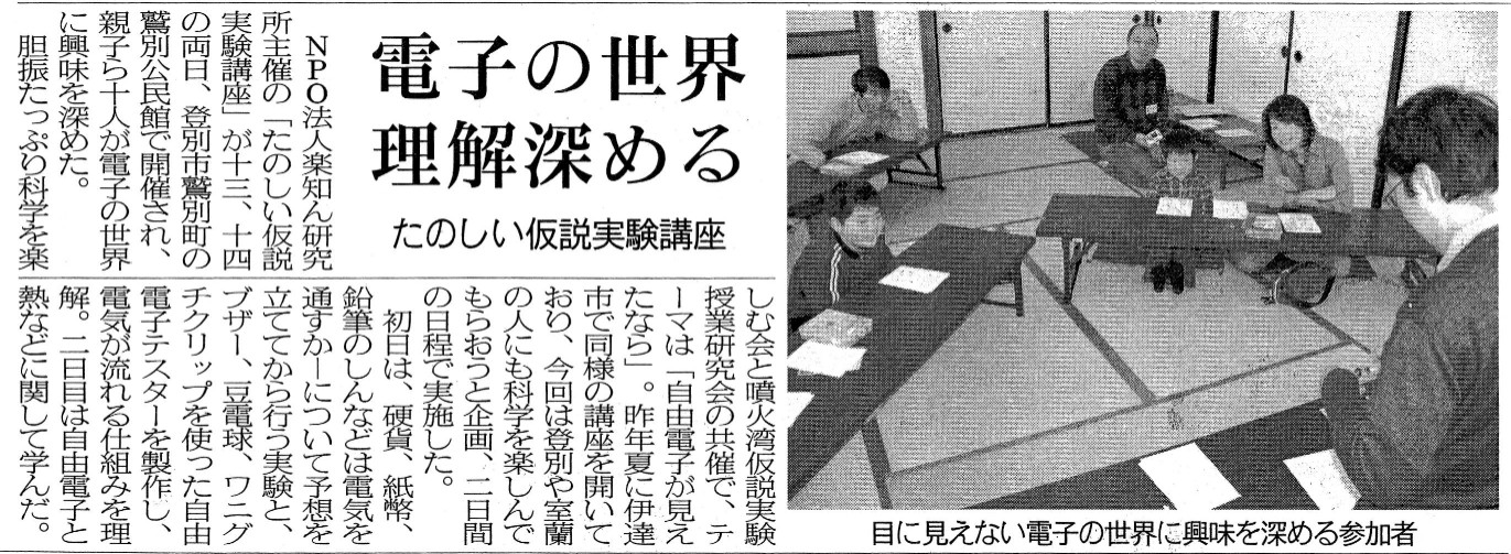 仮説実験講座」の記事が地元紙の「室蘭民報」の朝刊に掲載されま した。 講師の吉田さんと宗像さんは去年まで伊達市でこの企画を開催し ていましたが,今年は登別市と室蘭市の小学校にビラを配って開催 したのです。 それではその記事をご紹介します。