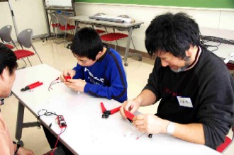 たのしい仮説実験講座」が開かれました。会場は旭川医療 情報専門学校で,内容は《自由電子が見えたなら》でした。 参加者は大人2名+高校生2名+小学生2名です。 高校生はスタッフが顧問をしている高校の科学部の 部員さんだそうです。 初日は極寒の吹雪(さすが北海道!?)だったそうです(^^; それでも参加していただけるんだから凄いですよね。 科学部の生徒さんたちは写真左下の自由電子テスターを2日目から 参加する人の分も作って大活躍だったそうです。おかげで講座の満足度 も高かったようですし努力が報われてよかったですね(^^)/ そうそう「親子(孫)でたのしい仮説実験講座」では実験セットの オミヤゲがついてくるんですが,今回はこの「自由電子BOX」でした。 中身は, ホンモノの金・銀・銅泊, ホンモノの金・銀・銅でつくった金紙,銀紙,銅紙, 水銀スイッチ,石墨,フェライト磁石,アルニコ磁石…… がセットになってます。なんかワクワクしますねぇー。 |