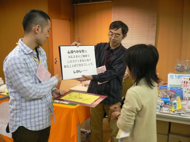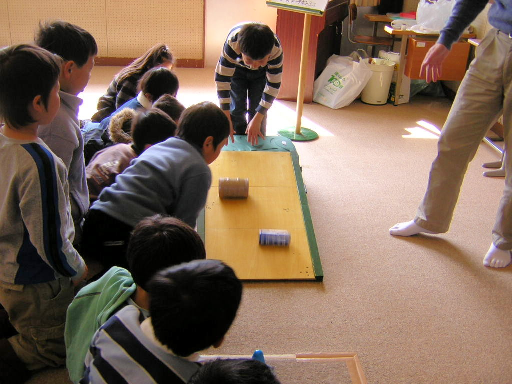 栗原さんが大道仮説実験〈ころりん〉をやりました。 参加者は小学校1年~6年までの20名と 親も5名ほどいらっしゃったそうです。 フリップブック ↓ 紙芝居(B面だけ) ↓ ものづくり:ピコピコカプセルとピコピコカプセル版 と,この流れで1時間30分くらいかかったそうです。 やっぱりこうした機会にちょうどいいくらいなんですね(^^) 今回は新しくなったフリップブックと紙芝居ブックを はじめて使ってみたそうです。なんでも紙芝居のB面が 〈ころりん〉の魅力が出ていて良かったそうです。 さりげなく後ろの転がったモノ達に「勝ち」「負け」の札がついていて 実験結果が分かりやすく工夫されていますね~。 こういうのいいですね。