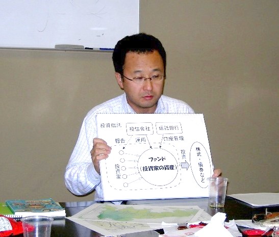 「衣食足りたら〈他人の笑顔〉研究会」が行なわれました。 変わったタイトルですが,「衣食足りた時代」=成熟経済時代の ものの見方・考え方を勉強していこうというものです。 今の日本のように,物質的な欲求がかなり満たされた社会では, それ以上着たり食べたりしても,あまりたのしくありません。 それよりも〈他人の笑顔〉を求めていくようになるのです。 (板倉聖宣『発想法かるた』より) 私たち楽知ん研究所の場合は,〈たのしい科学〉の世界をとおして, お客さんの笑顔を生み出していくということです。 そしてこれから,さまざまな分野で〈他人の笑顔〉を 生み出していく活動が,一層さかんになるでしょう。 このような〈成熟経済時代〉を心豊かに生きていく上で 〈長期投資〉は,大切な道具になると考えています。 そんな,これからの社会や生き方のイメージを 思い描くための勉強会です。 (このあたりはこちらをご参考ください) 講師は,楽知ん投信㈱の秋田総一郎さんと西生智久さんでした。 午前10時から夕方4時半ころまで,ほぼ1日がかりの会だったそうです。 〈私益と公益〉〈お金の流れは社会をつくる〉〈長期投資〉 といったキーワードから広がる話題を, 参加者7人と講師がヒザを交えてじっくり語りあいました。 会の終了後参加者の方々が記入したアンケートでは, 全員が「5」(たいへんたのしかった)の点数だったとのこと。 なかなかスゴイですね~(^^)とても充実した会だったようです。
